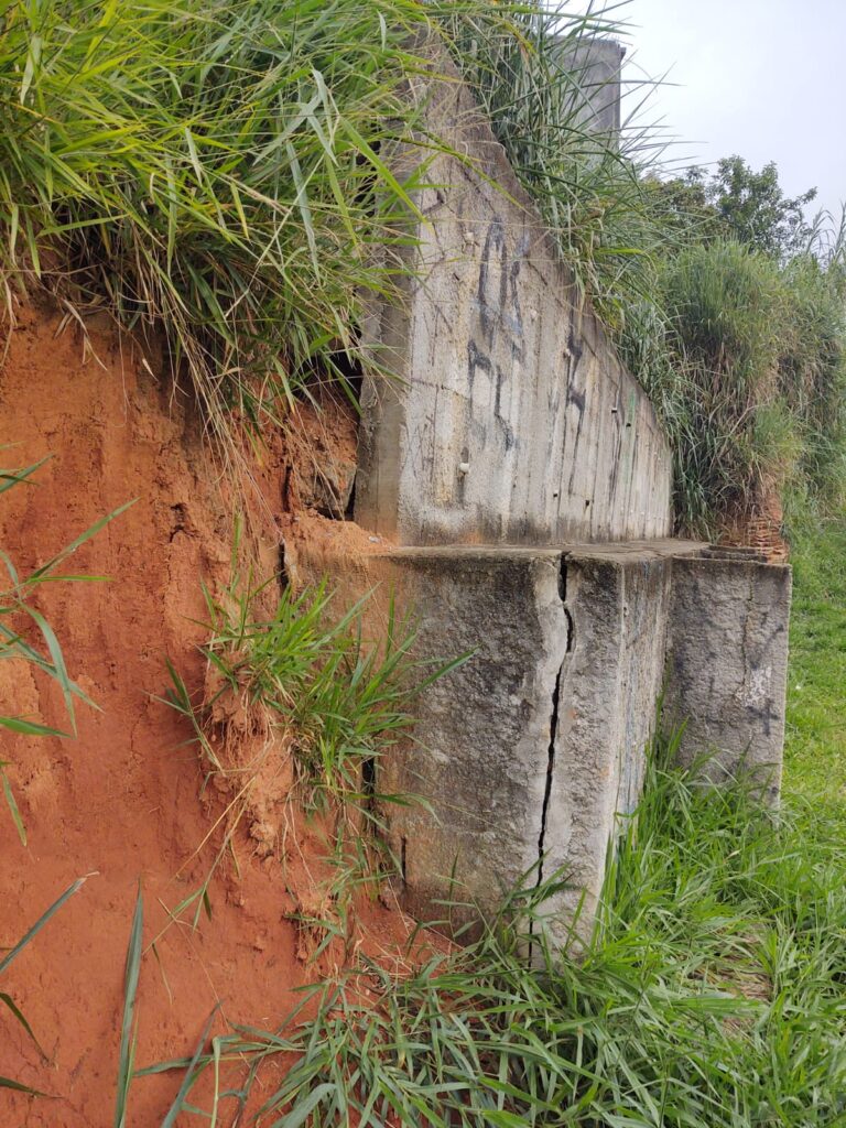 Construído em março de 2020, o muro de arrimo na altura do número 596 da Rua Hidelbrando da Silveira, na denominada Viela 09, no Jardim São João, em Ferraz de Vasconcelos, parece que não suportou, sobretudo, o volume das chuvas torrenciais que caíram na cidade nos últimos meses e ameaça desmoronar (foto) a qualquer momento. A proteção situa-se pontualmente na parte esquerda do antigo campo do Estrela (sentido centro-bairro), atual Complexo Poliesportivo Edson Arantes do Nascimento, o Rei Pelé.