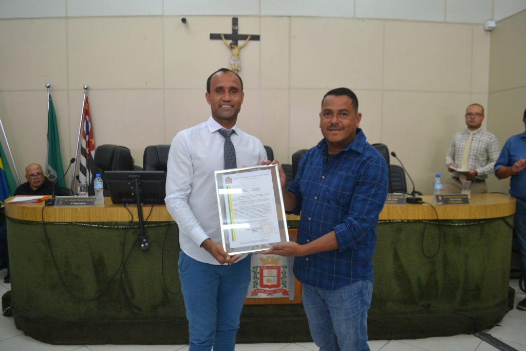 O presidente da Câmara Municipal de Ferraz de Vasconcelos, vereador Hodirlei Martins Pereira (PSD), o Mineiro (esq), homenageou com uma moção de aplausos o Guarda Civil Municipal (GCM) André Luiz de Almeida, na sessão ordinária realizada de forma antecipada nesta terça-feira, dia 8. O tributo ao agente, de 47 anos, ocorreu em reconhecimento aos relevantes serviços prestados à sociedade ferrazense em geral.